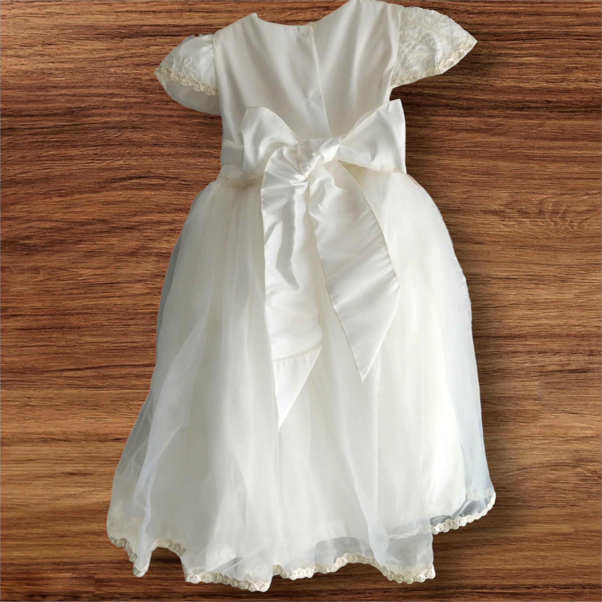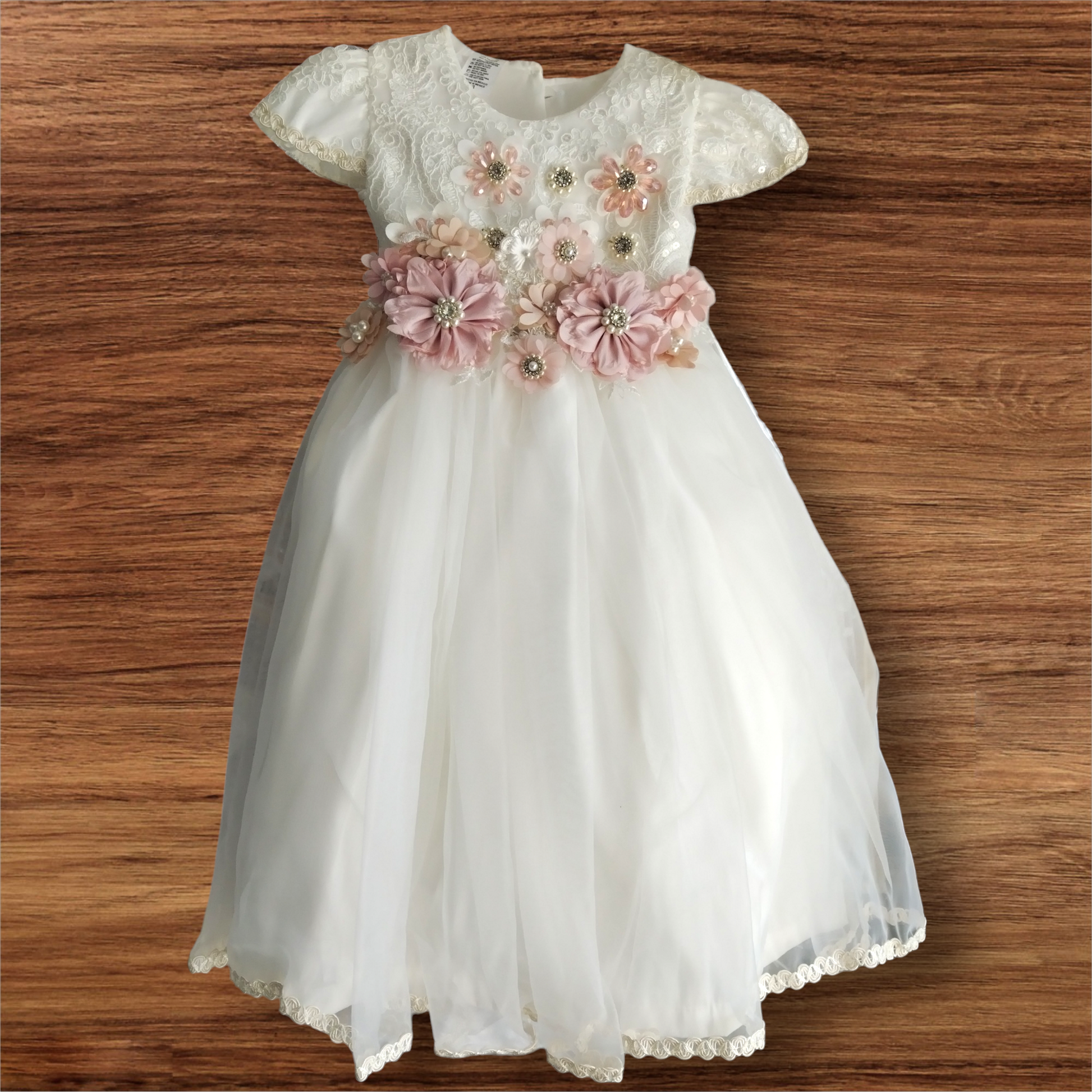 Esta hermosa batita para niña en color marfil presenta detalles de tul fino y flores con cristalería para un toque elegante y delicado.