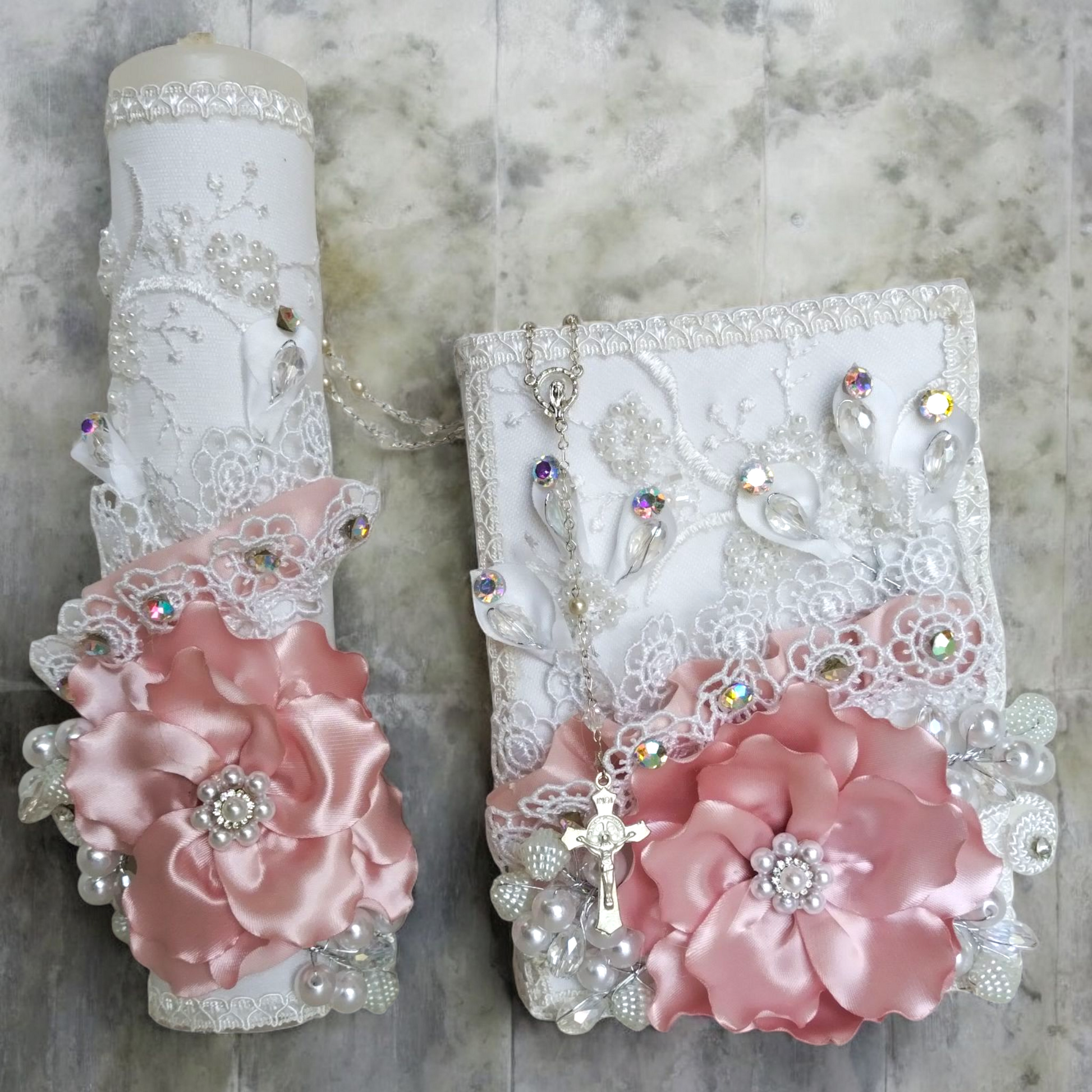 Este Kit Vela de Comunión para niñas es una opción hermosa y completa para celebrar este importante evento. Incluye un cirio, una biblia forrada y un rosario, todo en un delicado blanco. Perfecto para acompañar a la niña en este día tan especial y crear recuerdos duraderos.