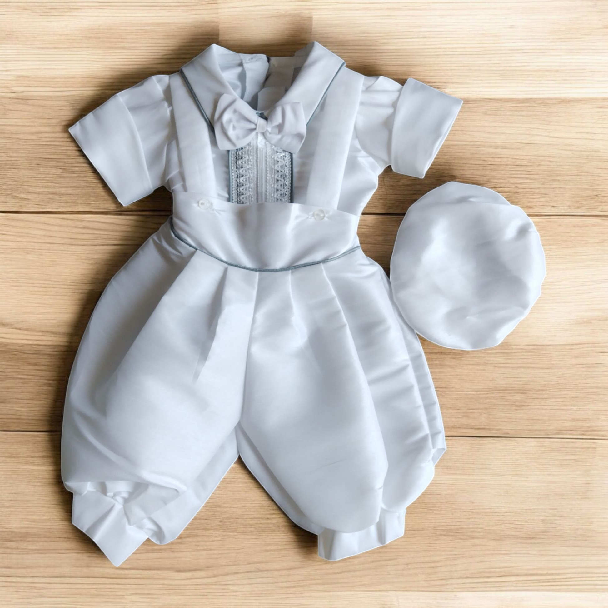Este hermoso ropón en tono ivory es perfecto para tu niño. Con pantalones bombachitos con tirantes y una camisa de manga 3/4, ofrece frescura y suavidad para mayor comodidad. Además, cuenta con un forro en la parte interna y un moñito desmontable para un detalle adicional. ¡Un estilo clásico y cómodo para tu pequeño!