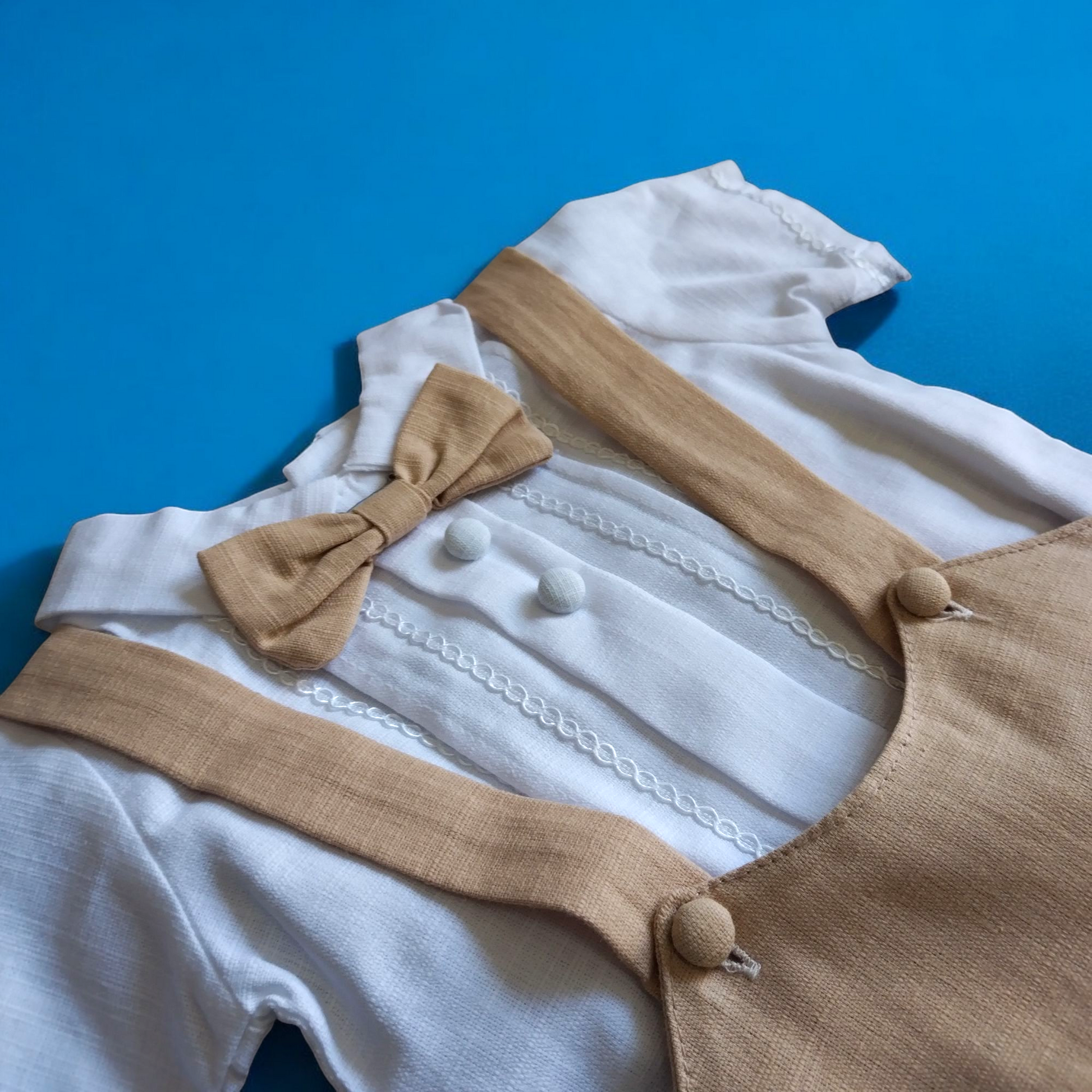 Este hermoso ropón de lino es perfecto para ese día especial. Su suavidad y frescura lo hacen cómodo para tu niño, y su pantalón bombachito y moñito desmontable lo hacen elegante.