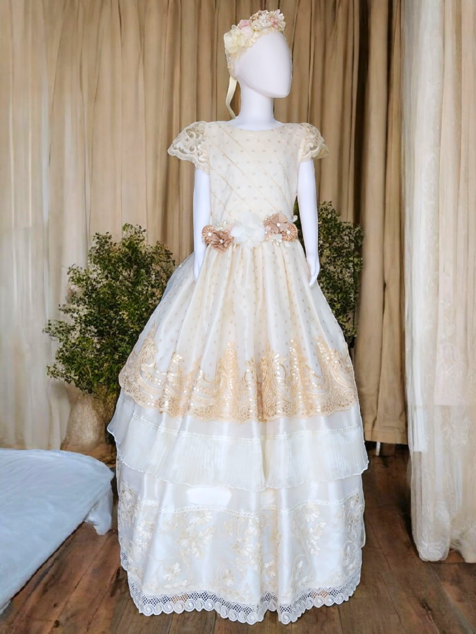 Este hermoso vestido de comunión para niña en color beige T10 está confeccionado con acabados bordados a mano y cristalería fina. Además, cuenta con un forro en la parte interna para brindar comodidad y evitar que pique. Ideal para una ocasión especial con un toque elegante y sofisticado.