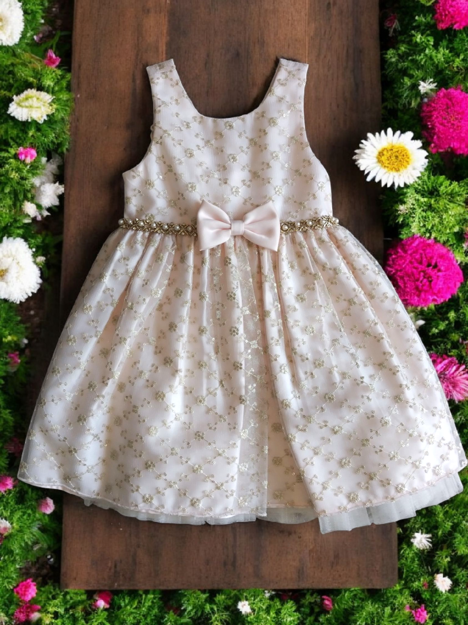 Este hermoso vestido de fiesta para niña en tonos ivory/rosa es perfecto para cualquier ocasión especial. Su tul fino bordado a mano le agrega un toque de elegancia y delicadeza. Disponible en talla T2. ¡Haz que tu pequeña se sienta como una princesa con este vestido!