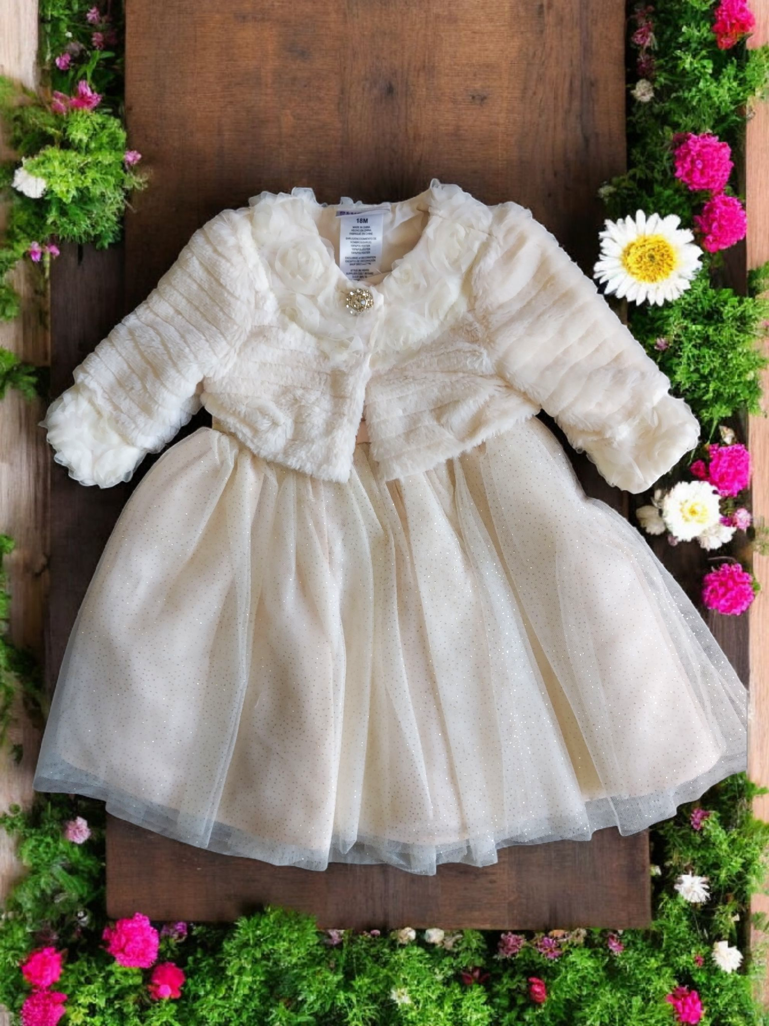 Este hermoso vestido ivory es perfecto para cualquier fiesta o evento especial. Combina a la perfección con su saco corto a juego de peluche, con detalles en tul fino que le dan un toque elegante y sofisticado. Disponible en tallas T18M-T2. ¡Un conjunto imprescindible en el guardarropa de cualquier niña!