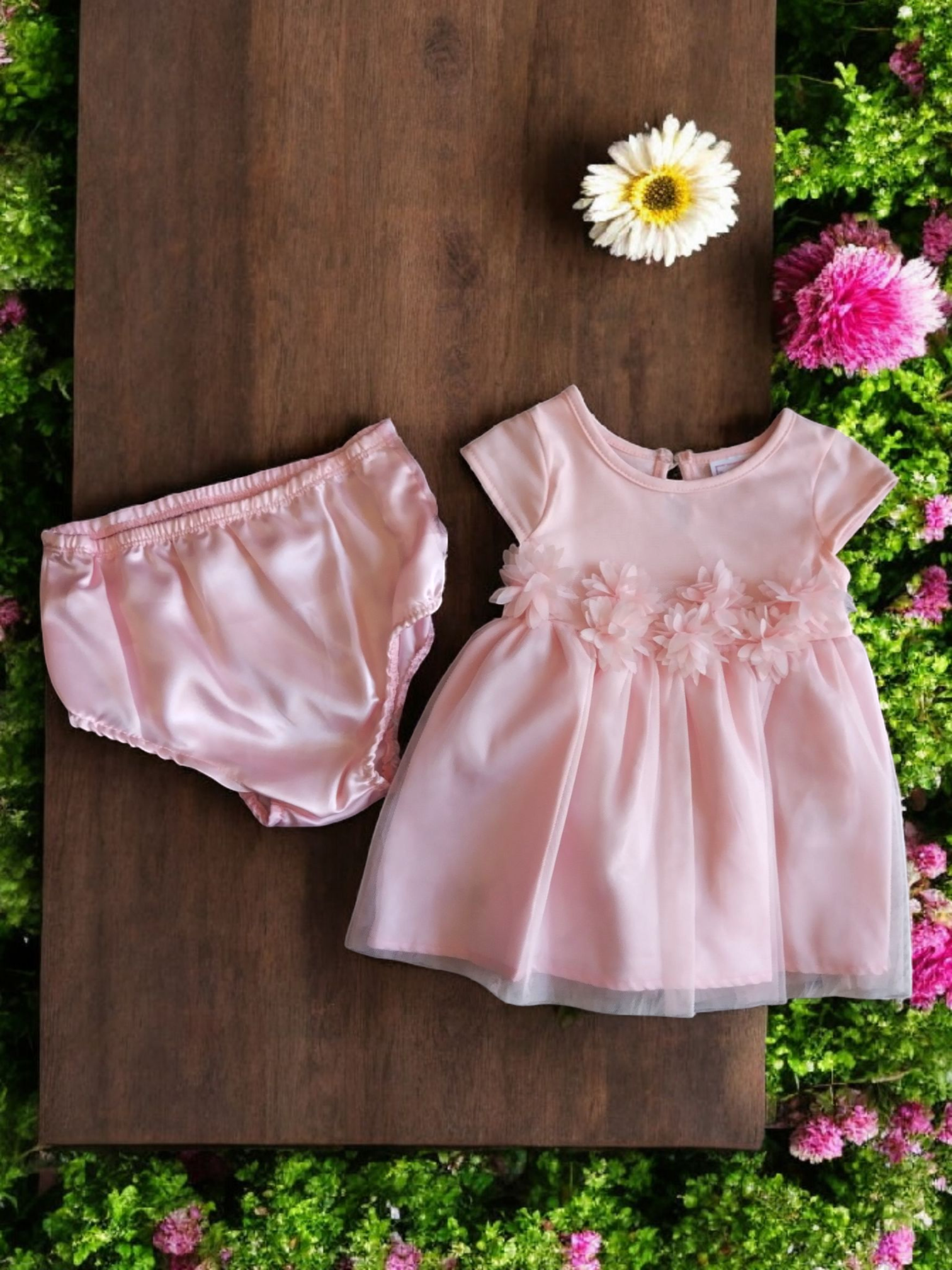 Este hermoso vestido cuenta con delicados detalles en tul fino, que le dan un toque elegante y femenino. Además, incluye un calzoncito a juego para mayor comodidad. Con este conjunto, lucirás radiante y sofisticada en cualquier ocasión. ¡Disfruta de la moda con estilo y confort!