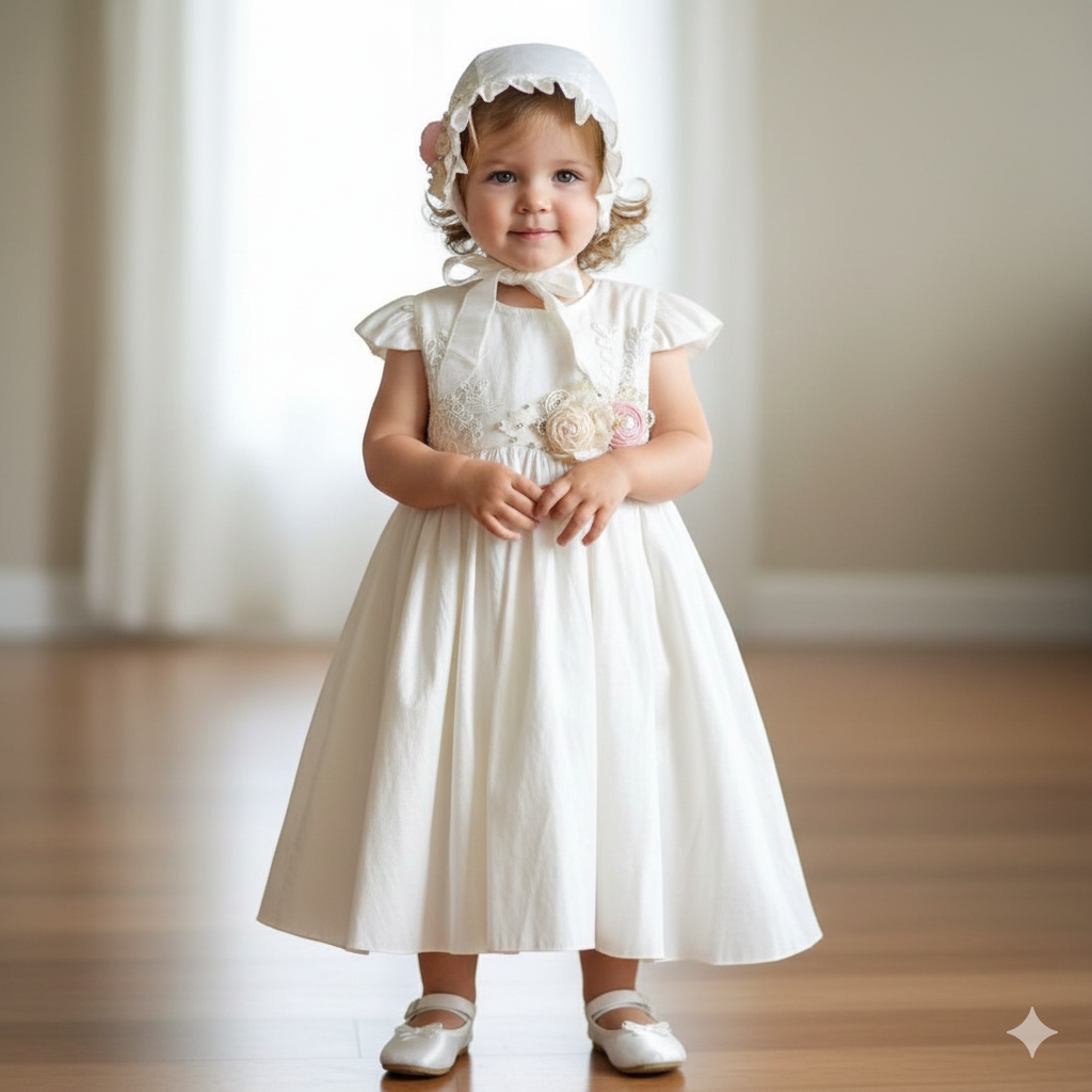 El Vestido Niña en color ivory es la elección perfecta para tu pequeña. Con detalles bordados a mano y confeccionado con una tela tipo manta que no irrita ni pica la piel, garantiza su comodidad y estilo. ¡Haz que se sienta como una princesa con este vestido especial!