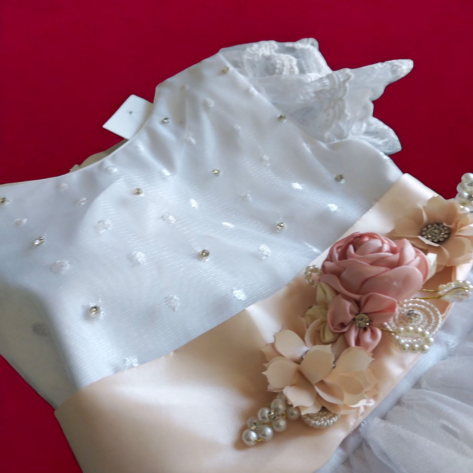 Este hermoso vestido blanco para niñas es perfecto para cualquier ocasión especial. Con detalles en tul y una cinta con delicados adornos florales en el medio, hará que tu niña se vea elegante y femenina. Hecho con materiales de alta calidad, este vestido es cómodo y duradero. ¡Un must-have en el guardarropa de tu pequeña princesa!
