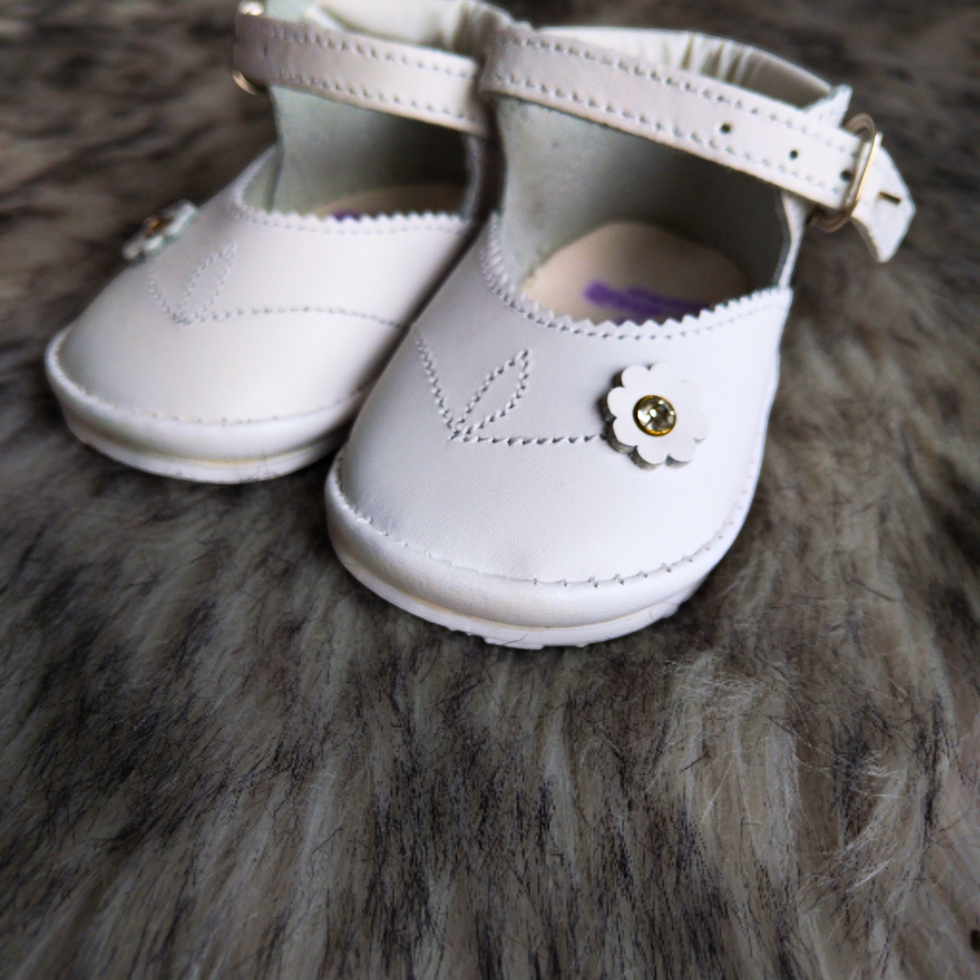 Los zapatos tienen un diseño elegante y delicado, con acabado brillante similar a la piel, Cada flor está hecha de pétalos superpuestos de tela, con un pequeño cristal o piedra brillante en el centro de cada flor. Las flores dan a los zapatos un aspecto sofisticado y delicado, ideal para una ocasión especial como un bautizo