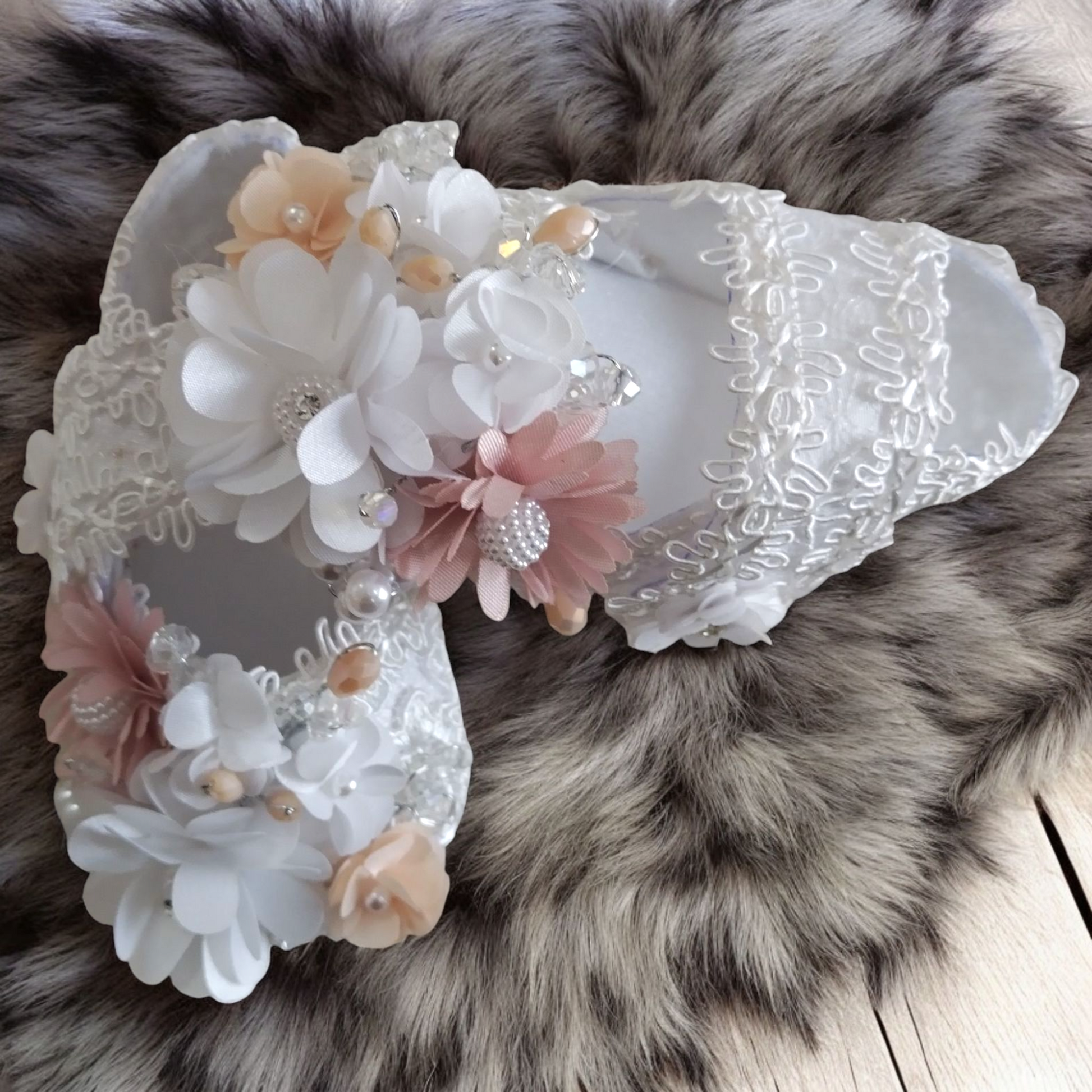 Estos hermosos zapatos blancos se destacan por su elegante diseño sin suela, bordados a mano y detalles en cristalería fina. Perfectos para bautizos y ocasiones especiales, brindan comodidad y estilo a tu niña con un toque de sofisticación. ¡Hazla lucir hermosa con estos zapatos exclusivos!