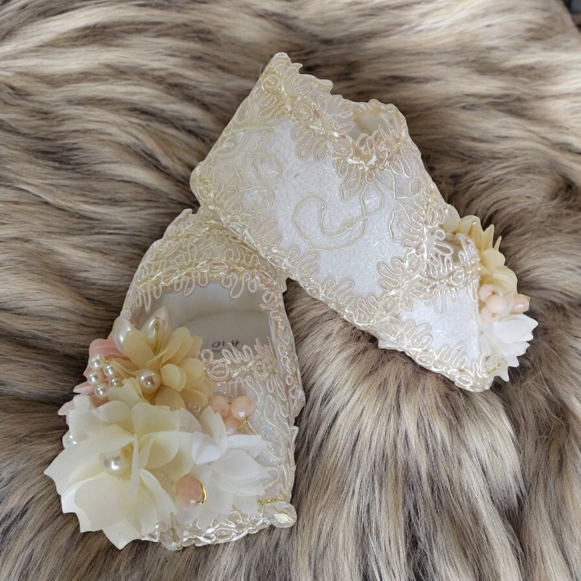 Estos zapatos sin suela de bautizo son el complemento perfecto para cualquier outfit de tu niña. Con un elegante color ivory y detalles bordados a mano, estos zapatos son hechos con cristalería fina y de alta calidad. ¡Haz que tu niña se vea hermosa y cómoda con estos zapatos!